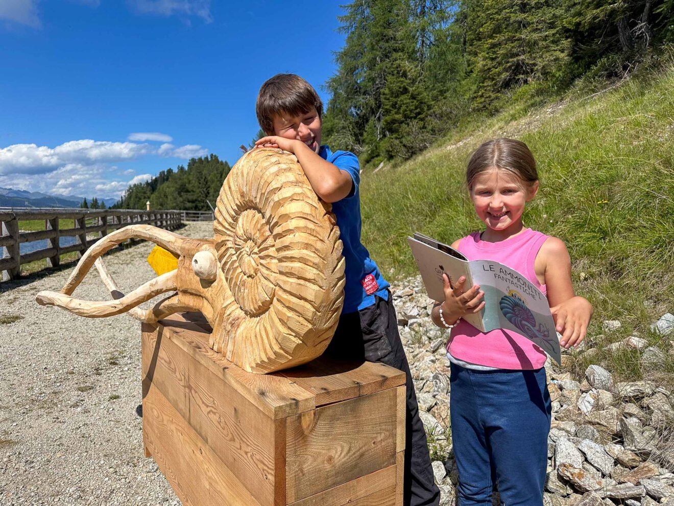 Lungo il percorso si incontrano 7 ammoniti fantastiche scolpite nel legno che sono tornate dal passato, con un viaggio nel tempo di 200 milioni di anni, per consegnare 7 doni ai bambini. E mentre conoscono una pagina di storia di queste montagne, con curiosità ricevono 7 poteri straordinari per difendere la natura.
