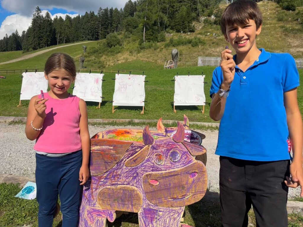 In questo prato comanda…. la mucca! È lei a decidere il colore del giorno. Fuori dall’arrivo della prima cabinovia, vi attende “Mucca comanda colore“: quattro tele grezze invitano a dipingere usando un solo colore al giorno, in tutte le sue sfumature. Perché in natura esistono infinite tonalità e bisogna imparare ad apprezzarle.