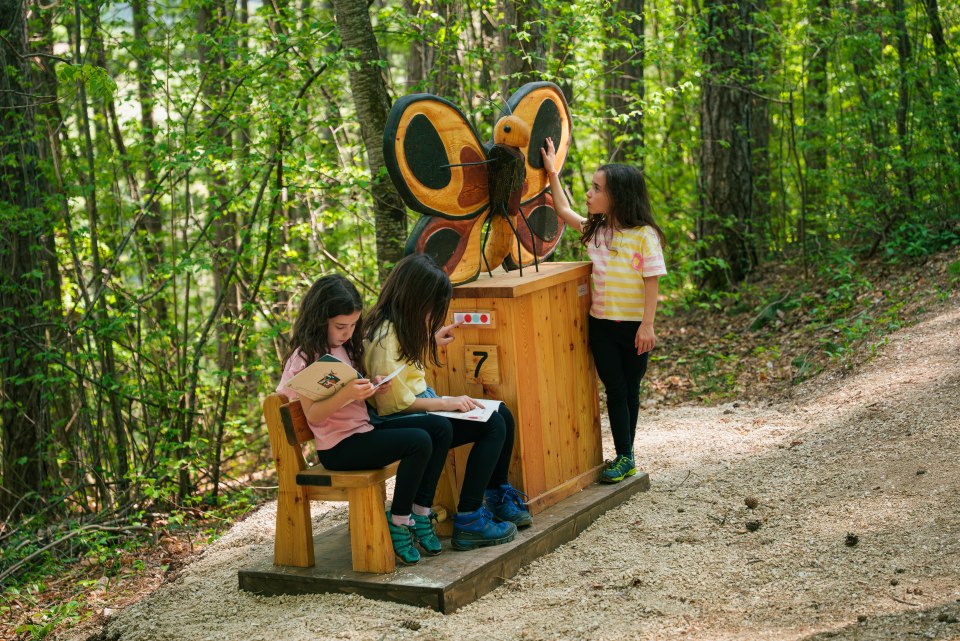 Accanto ad ogni animale c’è una seduta, per far immedesimare i bambini nella storia e diventarne parte. Tutte le installazioni sono realizzate con materiali naturali e si integrano perfettamente nel paesaggio circostante.